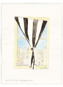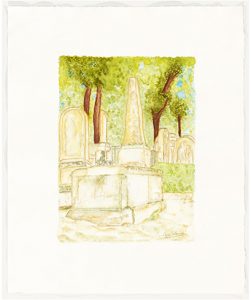 Auf Stationen und Bahnhöfen, das ist bekannt, kann man verloren gehen. Man steigt in einen Zug und fährt an ein bestimmtes Ziel. Man kann aber auch überhaupt nicht in einen Zug steigen, im Bahnhof selbst untergehen und einfach das Treiben um sich herum beobachten. Der Bahnhof Gare Saint-Lazare zum Beispiel ist ein Ort zum Untergehen und einer der tiefstgelegenen Punkte von Paris. Die Schalterhalle nennt sich drohend „Salle des pas perdus“: Saal der verlorenen Schritte. Vergleichbar dem Reisenden im Saal der verlorenen Schritte, hat Jue Salomo sich entschlossen nicht in den Zug zu steigen. Als aufmerksamer Beobachter, mitten im Saal stehend, ist er dabei, die Magie des Moments einzufangen. Auf der Suche nach dem Augenblick skizziert Jue Salomo seine Pariser Quartiers, Interieurs, Brücken und Friedhöfe in flinkem Duktus als Momentaufnahmen von ausgewählter Farbigkeit. Die subjektive Darstellung der Landschaften ist genau das, was Jue Salomo in seinen Aquarellen, Gouachen und Pastellen erreichen will. Dabei geht es nicht darum, ein detailgenaues Abbild des Originals zu schaffen, wenn ein flüchtiger Eindruck festzuhalten ist. Entscheidend ist ebenso die genaue Beobachtung der Lichtverhältnisse, um die Wiedergabe einer ganz bestimmten Stimmung zu verstärken. So kann die Brücke    Le pont au change (Abb. 4), am Abend silbrig schimmern oder die Grabsteine von Père-Lachaise (Abb. 5), Paris, Cimetière du Père-Lachaise I im hellen Mittagslicht Weißgold leuchten. Die Betonung des Atmosphärischen lehrte schon Eugène Louis Boudin, genauso wie Gustave Courbet, der die Impressionisten ermunterte, sich vom Alltagsleben inspirieren zu lassen. Auch Jue Salomo braucht sich nur aus dem Fenster seines Pariser Zimmers zu lehnen, um ein neues Alltagsmotiv vor Augen zu haben: der Blick in den schmalen Hof, auf eine Feuerleiter, auf unzählige kleine Schornsteine und romantische Dachgauben. La fenêtre d’ Anne (Abb. 6)